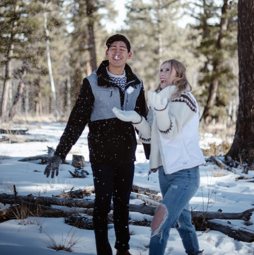 Nothing brings out genuine laughter like a playful snowball fight. It’s fun, spontaneous, and makes for some of the cutest candid engagement photos. Bonus: snow angels!